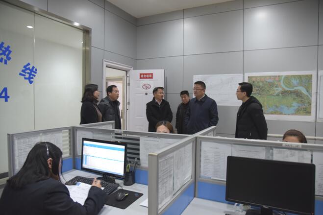 圖為:副市長吳之凌(右二)、市城發(fā)集團(tuán)黨委書記、董事長談國華(左三),副總經(jīng)理胡振宇(右三),在公司呼叫熱線中心檢查低溫雨雪冰凍天氣供水應(yīng)急保障工作。