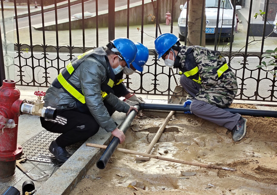 在抗擊疫情特殊時(shí)期,公司克服材料采購(gòu)、車(chē)輛調(diào)度、人員安排等困難,特事特辦,當(dāng)天便迅速安排公司客服中心、設(shè)計(jì)公司以及建設(shè)工程公司相關(guān)負(fù)責(zé)人趕赴現(xiàn)場(chǎng),進(jìn)行勘測(cè)設(shè)計(jì)、制定方案并組織材料施工,僅5小時(shí)便完成外部供水管道敷設(shè),具備了通水條件。