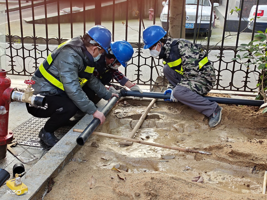 2月3日,公司接到緊急任務(wù),我市新型冠狀病毒肺炎疫情防控指揮部將新建臨時(shí)食堂,需盡快連通用水。疫情當(dāng)前,速度就是生命。為保障防疫指揮部后勤工作,當(dāng)天,市自來(lái)水有限公司迅速安排客服中心、設(shè)計(jì)公司以及建設(shè)工程公司相關(guān)負(fù)責(zé)人趕赴現(xiàn)場(chǎng),特事特辦,三個(gè)部門現(xiàn)場(chǎng)進(jìn)行勘測(cè)設(shè)計(jì)、制定方案并迅速組織材料施工,僅5小時(shí)便完成外部敷設(shè)供水管道96米、安裝閥門2臺(tái),具備了通水條件。根據(jù)指揮部計(jì)劃要求,待食堂其他建設(shè)項(xiàng)目完工后,工程公司后續(xù)將完成食堂內(nèi)外管道對(duì)接和排水管道的敷設(shè),保障防疫指揮部食堂最快時(shí)間正常通水。