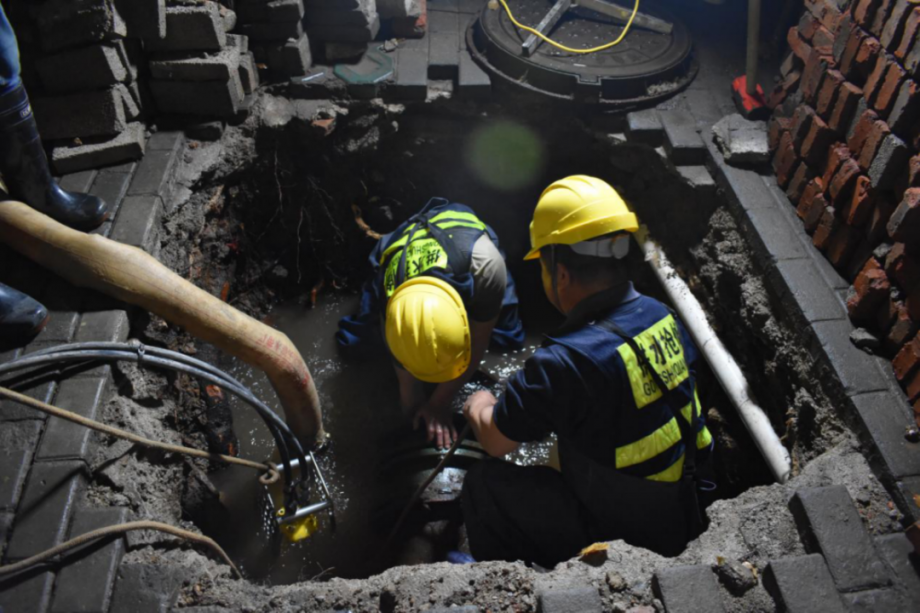 一路風(fēng)塵仆仆,濕透的衣服一直未曾干過(guò)。下午17時(shí)許,維修人員結(jié)束下陸萬(wàn)達(dá)廣場(chǎng)的檢測(cè)后匆匆趕到環(huán)湖路交警大隊(duì)。這里一處水管漏水,水滲透地面,向四周漫延,附近居民水壓低,著急等待搶修人員到來(lái)。在漏水的位置確定好漏點(diǎn)后,搶修人員開(kāi)始犯難了,漏水的地方位于外墻被圍欄環(huán)繞的花壇里,機(jī)器無(wú)法開(kāi)挖。維修人員只有采取人工挖。為避免破壞花壇植被和花壇中PE110戶表管,王明躍決定從花壇底部開(kāi)挖。一鍬接一鍬、一鏟連一鏟,太陽(yáng)漸漸隱藏余暉,卻依然肆意散發(fā)著巨大的熱量,夏天不能暢快用水煎熬著用戶的心,成為工人們感同身受的干事動(dòng)力。管道挖掘和搶修一直持續(xù)至次日凌晨3時(shí)左右,維修人員連續(xù)10余小時(shí)的作業(yè),挖出DN300鑄鐵管,焊接好鑄鐵管上60厘米裂縫,恢復(fù)片區(qū)供水。