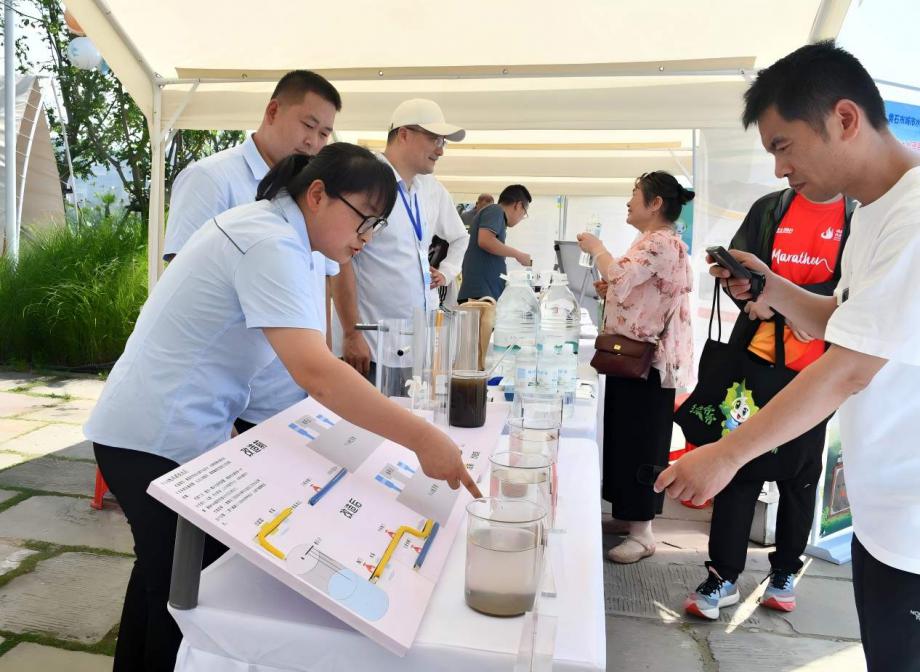 活動現(xiàn)場,污水公司的工作人員向市民展示了一瓶來自生活小區(qū)的渾濁污水,并表示經(jīng)過專業(yè)處理方式,5分鐘后將見證神奇變化。隨著時間推進,在工作人員演示下,污水依次經(jīng)歷“進水、氧化溝、高效沉淀池”等處理環(huán)節(jié),水質(zhì)逐漸由濁變清,這直觀的過程引得圍觀市民連連驚嘆,也揭開了城市污水處理的科技面紗。